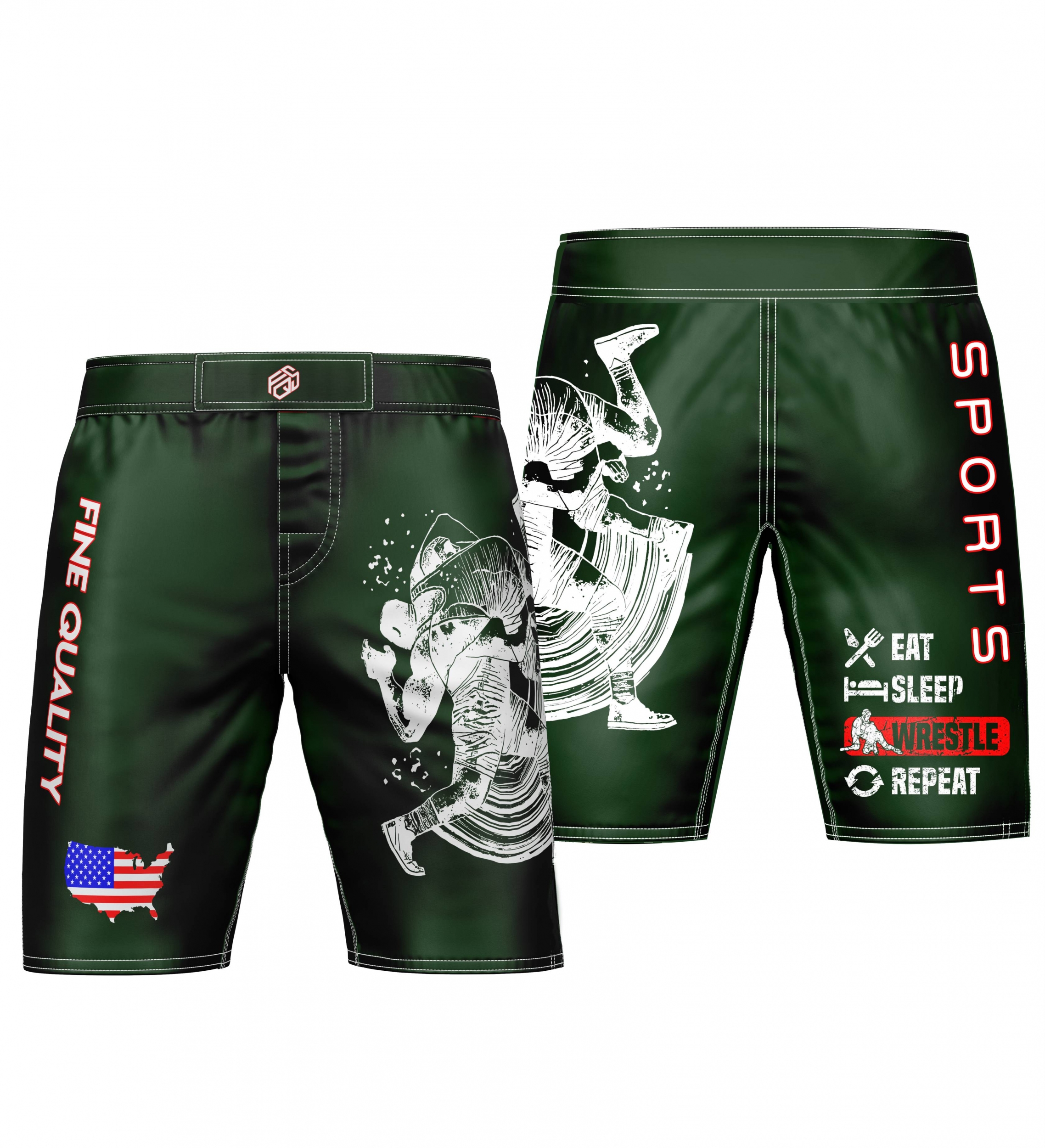 Custom sublimated Fine Quality Wrestling Shorts. The body is made of lightweight 4 way stretch fabric, a semi elastic waist band with faux closure. The most comfortable all around fight short you will ever own.  Wrestling Shorts specifically designed for those looking for an ultra lightweight short with free range of motion. Reinforced stitching in high-impact areas.Get sublimated Wrestling Shorts with an all-over print today; if you can imagine it, we can print it!